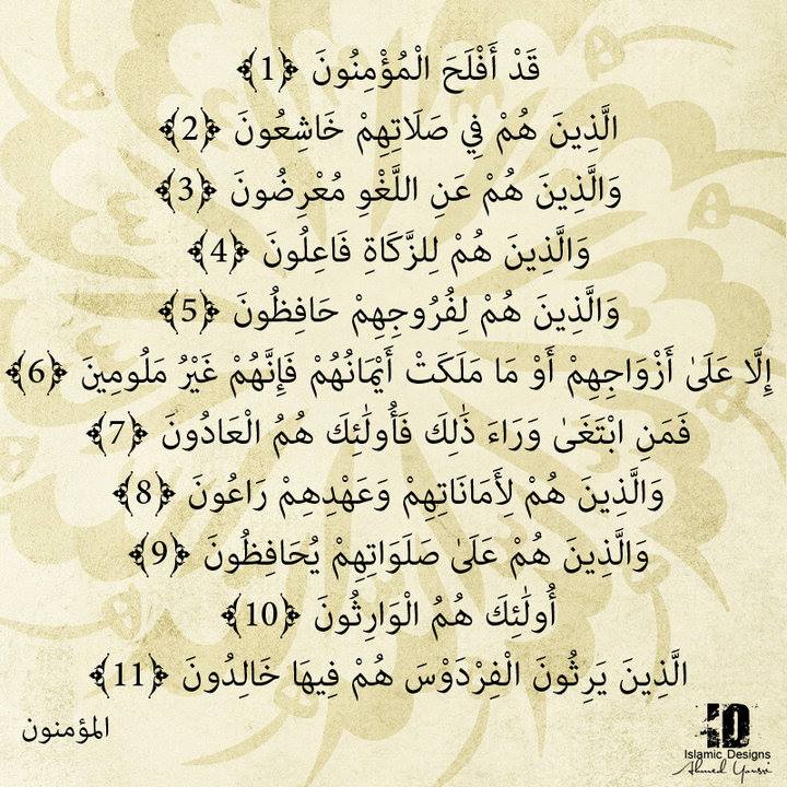 7 يونيو 2013  ·  ( 1 ) قد فاز المصدِّقون بالله وبرسوله العاملون بشرعه.( 2 ) الذين من صفاتهم أنهم في صلاتهم خاشعون، تَفْرُغُ لها قلوبهم،