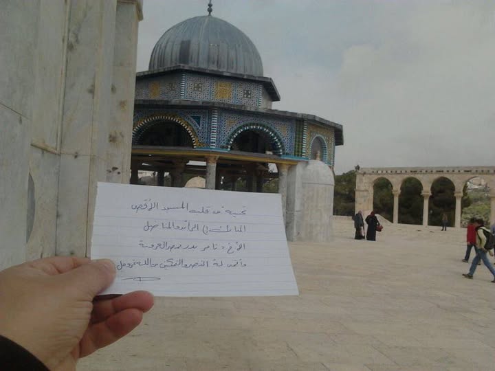 19 مارس 2014 تحية مني إلى أختي الفلسطينية المقدسية @بلسم الجراج لدعائها لي في المسجد الأقصى الشريف وتحيتي إلى كل أصدقائي الفلسطينيين المرابطين وأقول لكم