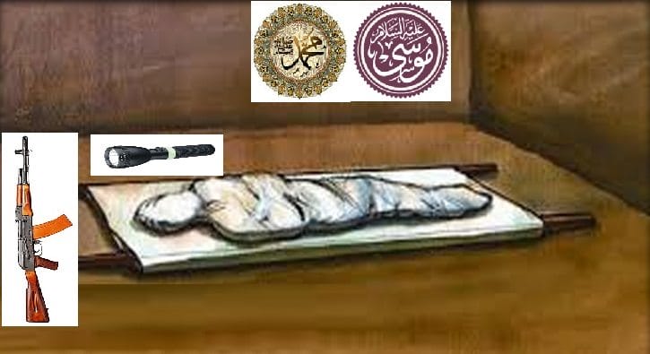 رأيت سيدنا محمد ﷺ والى يساره سيدنا موسى عليه السلام فوق الأرض ومستلقيين على ظهرهما ومغطين بكفنين منفصلين غير مربوطين لونهما يميل للون البني وكانا
